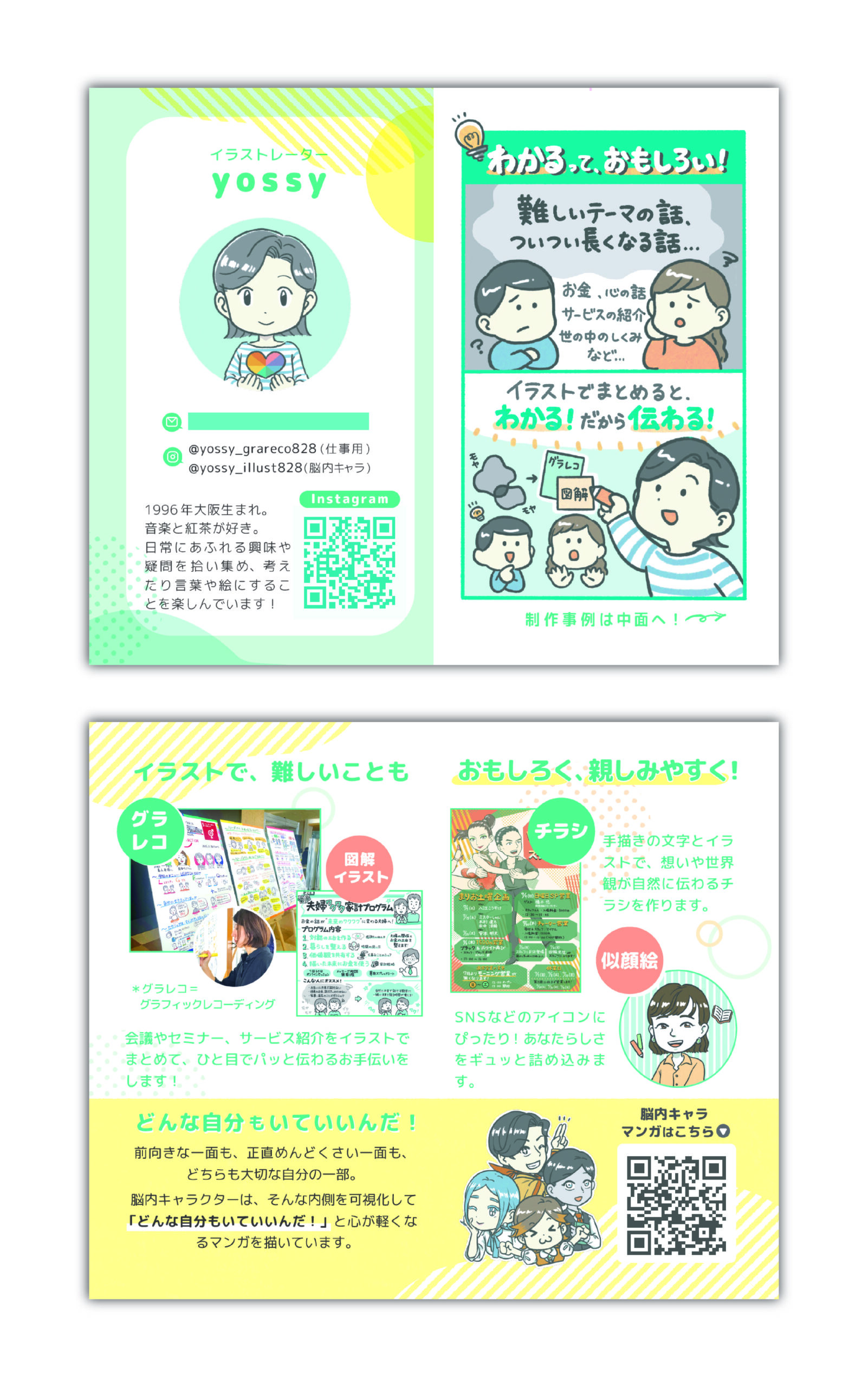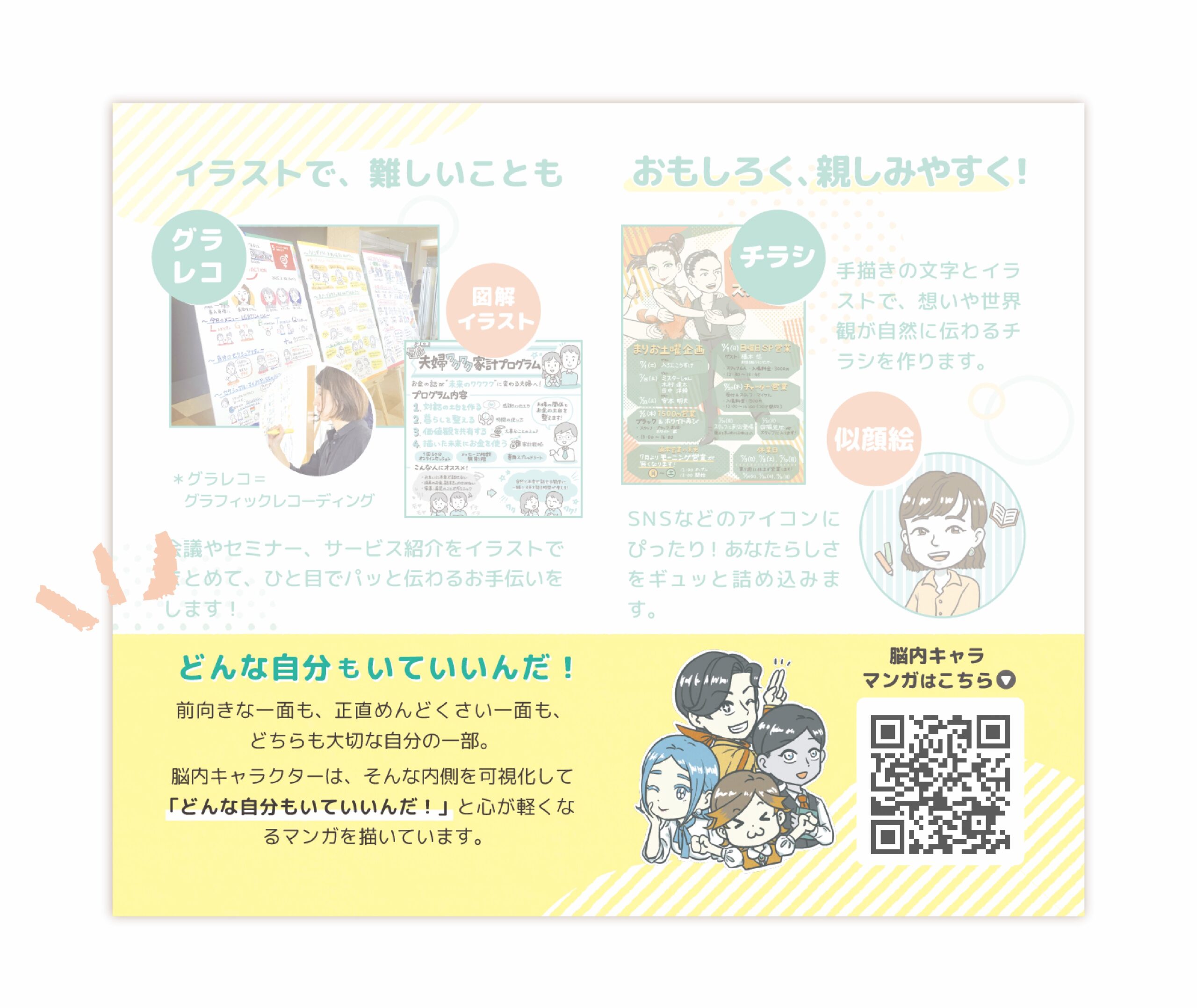 ・イラスト・グラレコ・図解・脳内キャラクターなど、活動の幅や人柄が伝わる構成にしたこと